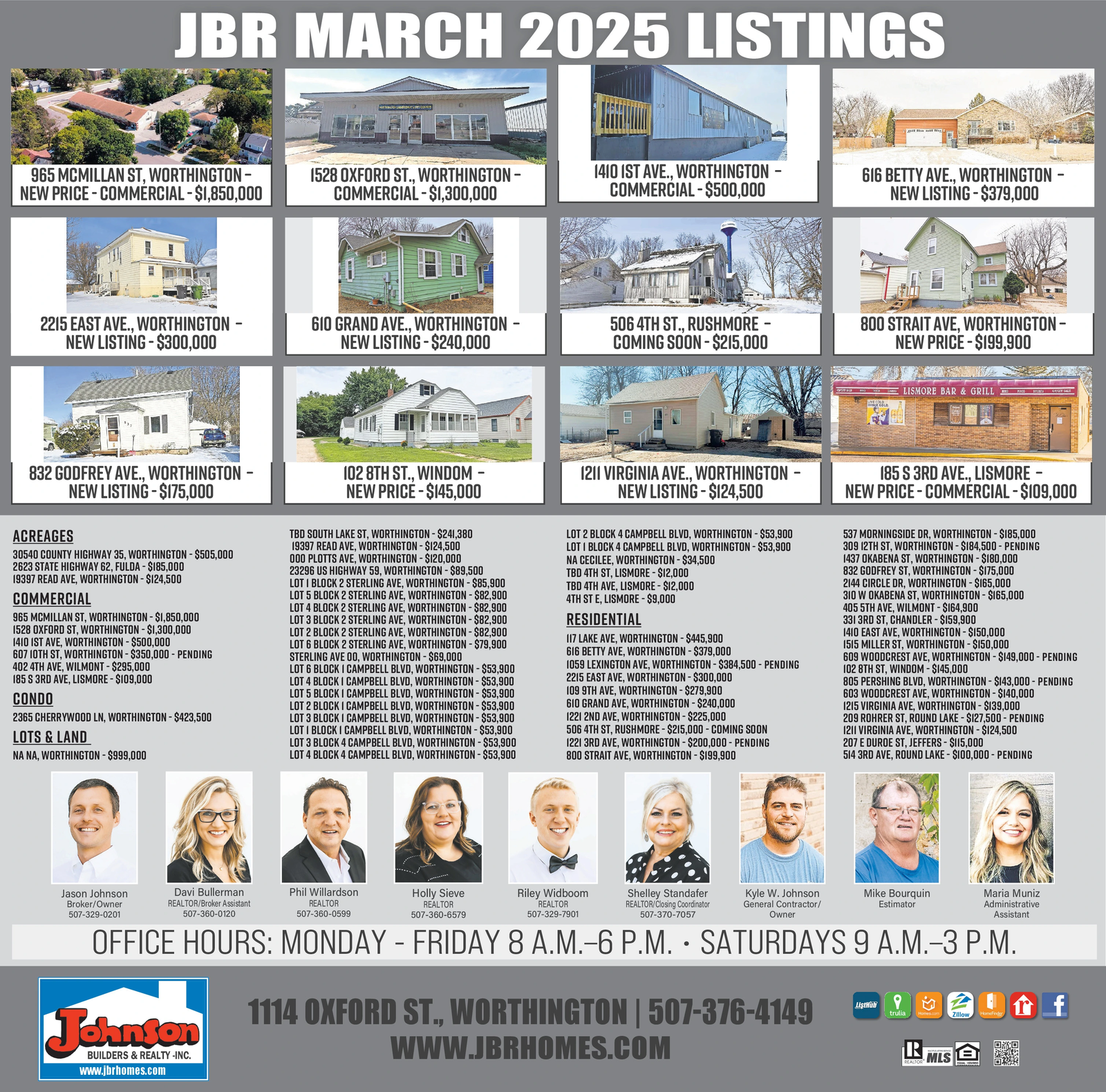 JBR MARCH 2025 LISTINGS 965 MCMILLAN ST, WORTHINGTON- NEW PRICE-COMMERCIAL-$1,850,000 1528 OXFORD ST., WORTHINGTON- COMMERCIAL-$1,300,000 1410 1ST AVE., WORTHINGTON COMMERCIAL-$500,000 616 BETTY AVE., WORTHINGTON NEW LISTING - $379,000 2215 EAST AVE., WORTHINGTON - NEW LISTING - $300,000 610 GRAND AVE., WORTHINGTON NEW LISTING - $240,000 - 506 4TH ST., RUSHMORE COMING SOON - $215,000 800 STRAIT AVE, WORTHINGTON - NEW PRICE - $199,900 I LISMORE BAR & GRILL 832 GODFREY AVE., WORTHINGTON - NEW LISTING -$175,000 ACREAGES 30540 COUNTY HIGHWAY 35, WORTHINGTON - $505,000 2623 STATE HIGHWAY 62, FULDA - $185,000 19397 READ AVE, WORTHINGTON - $124,500 COMMERCIAL 965 MCMILLAN ST, WORTHINGTON - $1,850,000 1528 OXFORD ST, WORTHINGTON - $1,300,000 1410 1ST AVE, WORTHINGTON - $500,000 607 10TH ST, WORTHINGTON - $350,000 - PENDING 402 4TH AVE, WILMONT - $295,000 185 S 3RD AVE, LISMORE - $109,000 CONDO 2365 CHERRYWOOD LN, WORTHINGTON - $423,500 LOTS & LAND NA NA, WORTHINGTON - $999,000 102 8TH ST., WINDOM - NEW PRICE -$145,000 - TBD SOUTH LAKE ST, WORTHINGTON - $241,380 19397 READ AVE, WORTHINGTON - $124,500 000 PLOTTS AVE, WORTHINGTON - $120,000 23296 US HIGHWAY 59, WORTHINGTON - $89,500 LOT I BLOCK 2 STERLING AVE, WORTHINGTON - $85,900 LOT 5 BLOCK 2 STERLING AVE, WORTHINGTON - $82,900 LOT 4 BLOCK 2 STERLING AVE, WORTHINGTON - $82,900 LOT 3 BLOCK 2 STERLING AVE, WORTHINGTON - $82,900 LOT 2 BLOCK 2 STERLING AVE, WORTHINGTON - $82,900 LOT 6 BLOCK 2 STERLING AVE, WORTHINGTON - $79,900 STERLING AVE 00, WORTHINGTON -$69,000 LOT 6 BLOCK I CAMPBELL BLVD, WORTHINGTON - $53,900 LOT 4 BLOCK I CAMPBELL BLVD, WORTHINGTON - $53,900 LOT 5 BLOCK I CAMPBELL BLVD, WORTHINGTON - $53,900 LOT 2 BLOCK I CAMPBELL BLVD, WORTHINGTON - $53,900 LOT 3 BLOCK I CAMPBELL BLVD, WORTHINGTON - $53,900 LOTI BLOCK I CAMPBELL BLVD, WORTHINGTON - $53,900 LOT 3 BLOCK 4 CAMPBELL BLVD, WORTHINGTON - $53,900 LOT 4 BLOCK 4 CAMPBELL BLVD, WORTHINGTON - $53,900 1211 VIRGINIA AVE., WORTHINGTON NEW LISTING - $124,500 LOT 2 BLOCK 4 CAMPBELL BLVD, WORTHINGTON - $53,900 LOTI BLOCK 4 CAMPBELL BLVD, WORTHINGTON - $53,900 NA CECILEE, WORTHINGTON - $34,500 TBD 4TH ST, LISMORE - $12,000 TBD 4TH AVE, LISMORE - $12,000 4TH ST E, LISMORE - $9,000 RESIDENTIAL 117 LAKE AVE, WORTHINGTON - $445,900 616 BETTY AVE, WORTHINGTON - $379,000 1059 LEXINGTON AVE, WORTHINGTON - $384,500 - PENDING 2215 EAST AVE, WORTHINGTON - $300,000 109 9TH AVE, WORTHINGTON - $279,900 610 GRAND AVE, WORTHINGTON - $240,000 1221 2ND AVE, WORTHINGTON - $225,000 506 4TH ST, RUSHMORE - $215,000-COMING SOON 1221 3RD AVE, WORTHINGTON - $200,000 - PENDING 800 STRAIT AVE, WORTHINGTON - $199,900 185 S 3RD AVE., LISMORE - NEW PRICE-COMMERCIAL - $109,000 537 MORNINGSIDE DR, WORTHINGTON - $185,000 309 12TH ST, WORTHINGTON - $184,500 - PENDING 1437 OKABENA ST, WORTHINGTON - $180,000 832 GODFREY ST, WORTHINGTON - $175,000 2144 CIRCLE DR, WORTHINGTON - $165,000 310 W OKABENA ST, WORTHINGTON - $165,000 405 5TH AVE, WILMONT - $164,900 331 3RD ST, CHANDLER - $159,900 1410 EAST AVE, WORTHINGTON - $150,000 1515 MILLER ST, WORTHINGTON - $150,000 609 WOODCREST AVE, WORTHINGTON - $149,000 - PENDING 102 8TH ST, WINDOM -$145,000 805 PERSHING BLVD, WORTHINGTON - $143,000 PENDING 603 WOODCREST AVE, WORTHINGTON - $140,000 1215 VIRGINIA AVE, WORTHINGTON - $139,000 209 ROHRER ST, ROUND LAKE - $127,500 - PENDING 1211 VIRGINIA AVE, WORTHINGTON - $124,500 207 E DUROE ST, JEFFERS - $115,000 514 3RD AVE, ROUND LAKE - $100,000 - PENDING Jason Johnson Davi Bullerman Phil Willardson Holly Sieve Riley Widboom Broker/Owner REALTOR/Broker Assistant 507-360-0120 REALTOR 507-329-0201 507-360-0599 REALTOR 507-360-6579 REALTOR 507-329-7901 Shelley Standafer REALTOR/Closing Coordinator 507-370-7057 Kyle W. Johnson General Contractor/ Owner Mike Bourquin Estimator Maria Muniz Administrative Assistant OFFICE HOURS: MONDAY - FRIDAY 8 A.M.-6 P.M. · SATURDAYS 9 A.M.-3 P.M. Johnson BUILDERS & REALTY -INC. www.jbrhomes.com 1114 OXFORD ST., WORTHINGTON | 507-376-4149 WWW.JBRHOMES.COM ListHub trulia M R MLS f Zillow JBR MARCH 2025 LISTINGS 965 MCMILLAN ST , WORTHINGTON- NEW PRICE - COMMERCIAL- $ 1,850,000 1528 OXFORD ST . , WORTHINGTON- COMMERCIAL- $ 1,300,000 1410 1ST AVE . , WORTHINGTON COMMERCIAL- $ 500,000 616 BETTY AVE . , WORTHINGTON NEW LISTING - $ 379,000 2215 EAST AVE . , WORTHINGTON - NEW LISTING - $ 300,000 610 GRAND AVE . , WORTHINGTON NEW LISTING - $ 240,000 - 506 4TH ST . , RUSHMORE COMING SOON - $ 215,000 800 STRAIT AVE , WORTHINGTON - NEW PRICE - $ 199,900 I LISMORE BAR & GRILL 832 GODFREY AVE . , WORTHINGTON - NEW LISTING - $ 175,000 ACREAGES 30540 COUNTY HIGHWAY 35 , WORTHINGTON - $ 505,000 2623 STATE HIGHWAY 62 , FULDA - $ 185,000 19397 READ AVE , WORTHINGTON - $ 124,500 COMMERCIAL 965 MCMILLAN ST , WORTHINGTON - $ 1,850,000 1528 OXFORD ST , WORTHINGTON - $ 1,300,000 1410 1ST AVE , WORTHINGTON - $ 500,000 607 10TH ST , WORTHINGTON - $ 350,000 - PENDING 402 4TH AVE , WILMONT - $ 295,000 185 S 3RD AVE , LISMORE - $ 109,000 CONDO 2365 CHERRYWOOD LN , WORTHINGTON - $ 423,500 LOTS & LAND NA NA , WORTHINGTON - $ 999,000 102 8TH ST . , WINDOM - NEW PRICE - $ 145,000 - TBD SOUTH LAKE ST , WORTHINGTON - $ 241,380 19397 READ AVE , WORTHINGTON - $ 124,500 000 PLOTTS AVE , WORTHINGTON - $ 120,000 23296 US HIGHWAY 59 , WORTHINGTON - $ 89,500 LOT I BLOCK 2 STERLING AVE , WORTHINGTON - $ 85,900 LOT 5 BLOCK 2 STERLING AVE , WORTHINGTON - $ 82,900 LOT 4 BLOCK 2 STERLING AVE , WORTHINGTON - $ 82,900 LOT 3 BLOCK 2 STERLING AVE , WORTHINGTON - $ 82,900 LOT 2 BLOCK 2 STERLING AVE , WORTHINGTON - $ 82,900 LOT 6 BLOCK 2 STERLING AVE , WORTHINGTON - $ 79,900 STERLING AVE 00 , WORTHINGTON - $ 69,000 LOT 6 BLOCK I CAMPBELL BLVD , WORTHINGTON - $ 53,900 LOT 4 BLOCK I CAMPBELL BLVD , WORTHINGTON - $ 53,900 LOT 5 BLOCK I CAMPBELL BLVD , WORTHINGTON - $ 53,900 LOT 2 BLOCK I CAMPBELL BLVD , WORTHINGTON - $ 53,900 LOT 3 BLOCK I CAMPBELL BLVD , WORTHINGTON - $ 53,900 LOTI BLOCK I CAMPBELL BLVD , WORTHINGTON - $ 53,900 LOT 3 BLOCK 4 CAMPBELL BLVD , WORTHIN